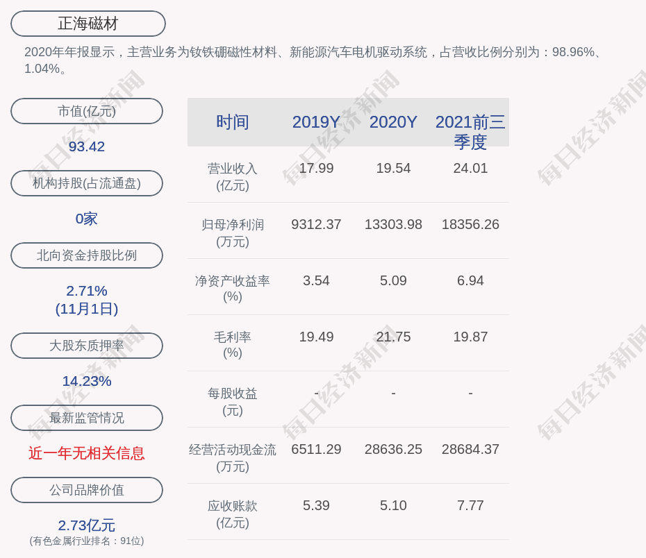 2020年年报显示,正海磁材的主营业务为钕铁硼磁性材料、新能源汽车电机驱动系统,占营收比例分别为:98.96%、1.04%。