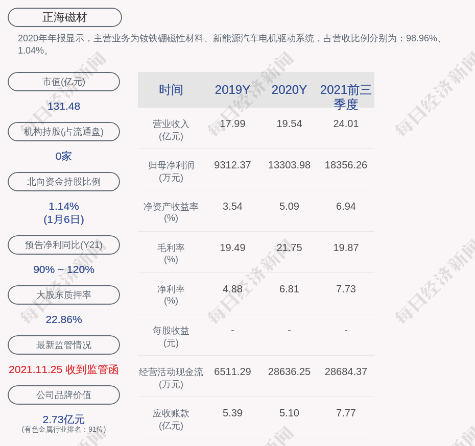 2020年年报显示,正海磁材的主营业务为钕铁硼磁性材料、新能源汽车电机驱动系统,占营收比例分别为:98.96%、1.04%。