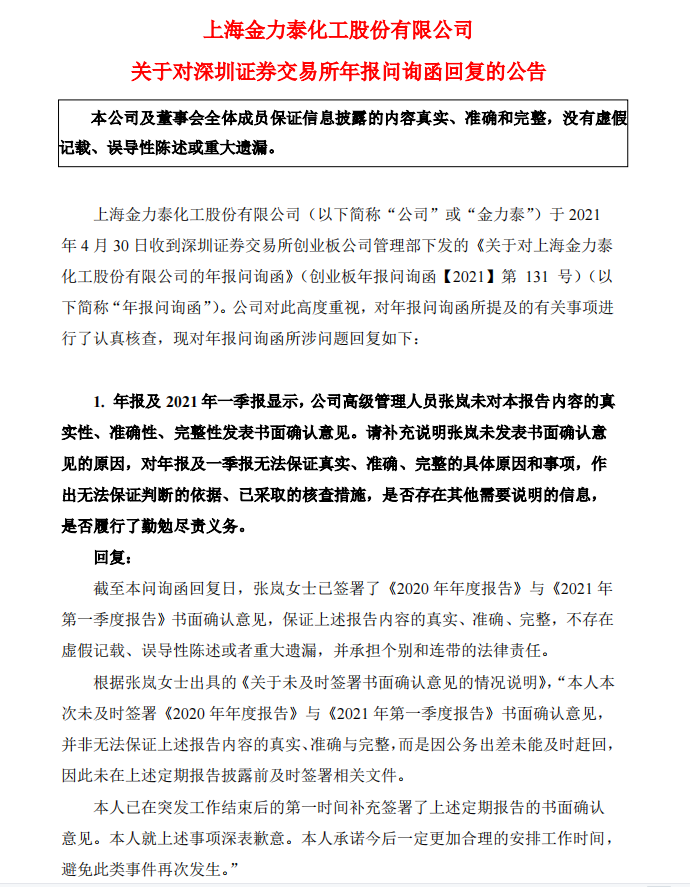 金力泰回复称:截至本问询函回复日,张岚已签署了《2020 年年度报告》与《2021 年第一季度报告》书面确认意见,保证上述报告内容的真实、准确、完整,不存在虚假记载、误导性陈述或者重大遗漏,并承担个别和连带的法律责任。