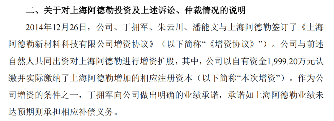 公告称,计划使用1999.20万元自有资金与自然人丁拥军、朱云川、潘能文共同出资对上海阿德勒新材料科技有限公司(以下简称“上海阿德勒”)进行增资扩股。作为公司增资的条件之一,丁拥军向公司做出明确的业绩承诺,承诺如上海阿德勒业绩未达预期则承担相应补偿义务。