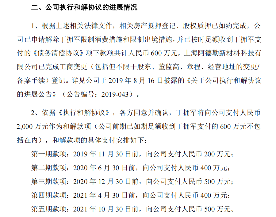 根据上述相关法律文件,相关房产抵押登记、股权质押已如约完成,公司已申请解除丁拥军限制消费措施和限制出境措施,并已按时足额收到丁拥军支付的《债务清偿协议》项下款项共计人民币 600 万元,上海阿德勒新材料科技有限公司已完成工商变更(包括但不限于股东、董监高、章程、经营地址的变更/备案手续)登记。