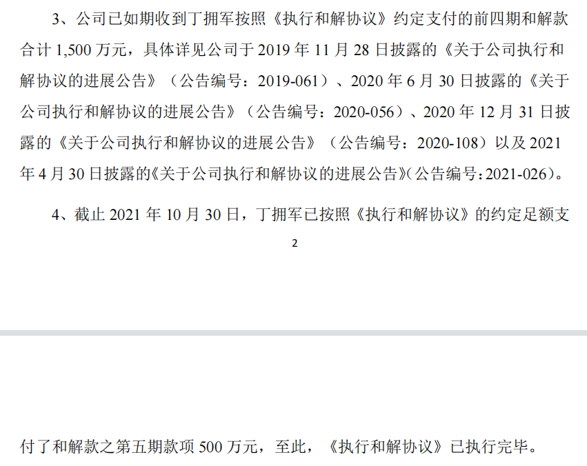 据上海金力泰化工股份有限公司 11 月 1 日发布的《关于公司执行和解协议的进展公告》称,截止 2021 年 10 月 30 日,丁拥军已按照《执行和解协议》的约定足额支付了和解款之第五期款项 500 万元,至此,丁拥军共支付了2600万元,《执行和解协议》已执行完毕。