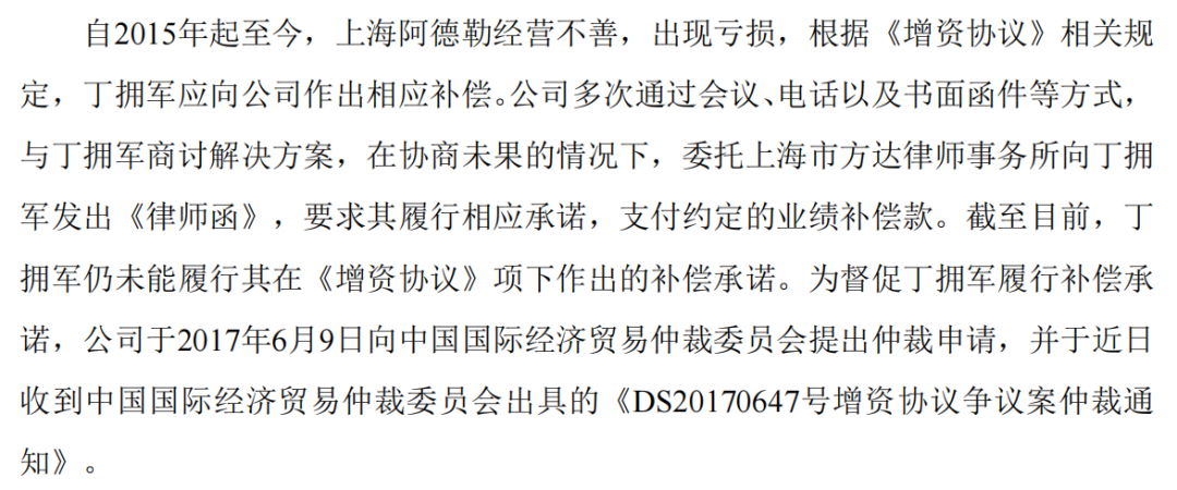 然而,金力泰没有想到的是,想法很美好,现实很骨感。自2015年起至2017年,上海阿德勒经营不善,出现亏损,根据《增资协议》相关规定,丁拥军应向金力泰作出相应补偿。