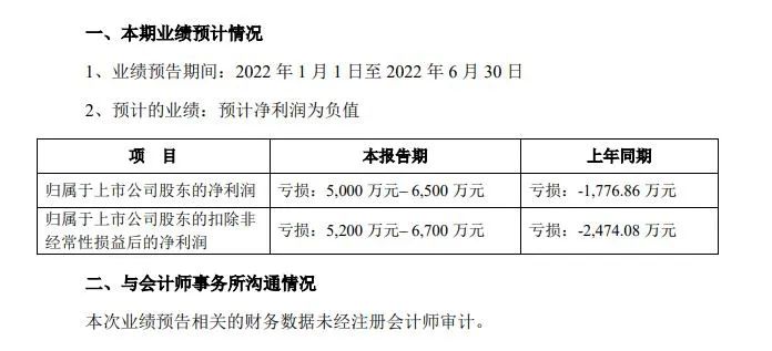 8月12日,金力泰(300225.SZ)发布2022年半年度业绩预告。公告显示:2022年1月1日至2022年6月30日预计净利润为负值,归属于上市公司股东的净利润预计亏损5000万元-6500万元(去年同期亏损1776.86万元);归属于上市公司股东的扣除非经常性损益后的净利润预计亏损5200万元-6700万元(去年同期亏损2474.08万元)。