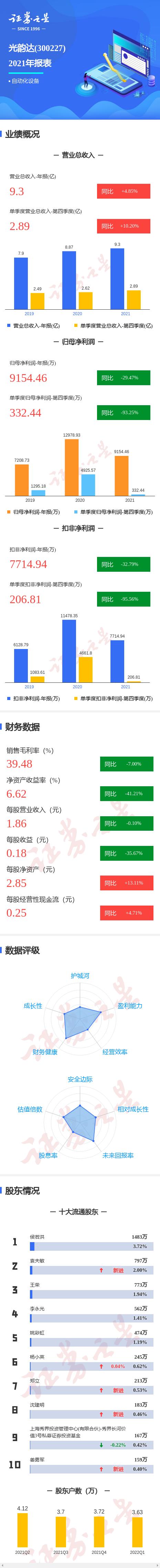 光韵达2021年报显示,公司主营收入9.3亿元,同比上升4.85%;归母净利润9154.47万元,同比下降29.47%;扣非净利润7714.94万元,同比下降32.79%;其中2021年第四季度,公司单季度主营收入2.89亿元,同比上升10.2%;单季度归母净利润332.45万元,同比下降93.25%;单季度扣非净利润206.81万元,同比下降95.56%;负债率35.33%,投资收益-277.62万元,财务费用1896.79万元,毛利率39.48%。