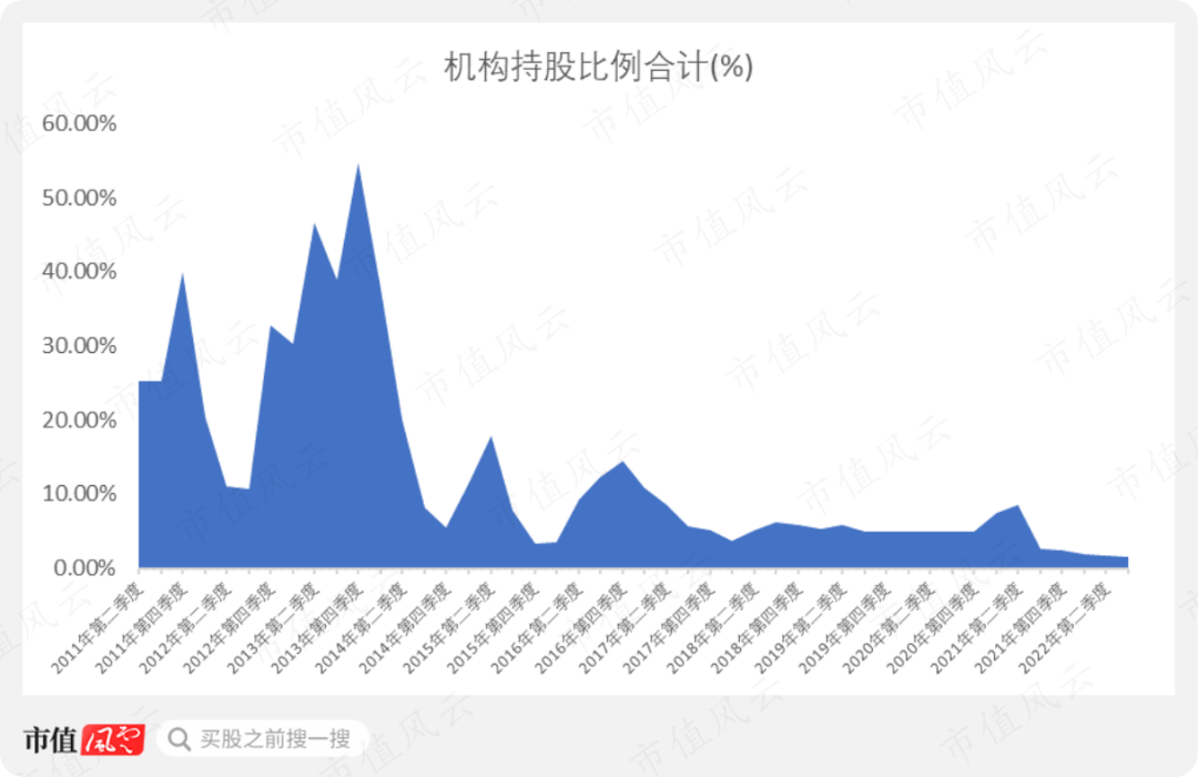 如果我们看到机构持股的情况,我们能够体会到机构的实际态度:2014年开始就发生了断崖式的减持。