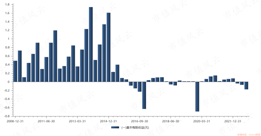 实际上,如果细心的读者朋友掏出计算器,将2015年开始的每股收益全部相加,算到2022年9月30日,累计7年零9个月,实际上最后的结果是个负数:总计每股亏损1.0638元。