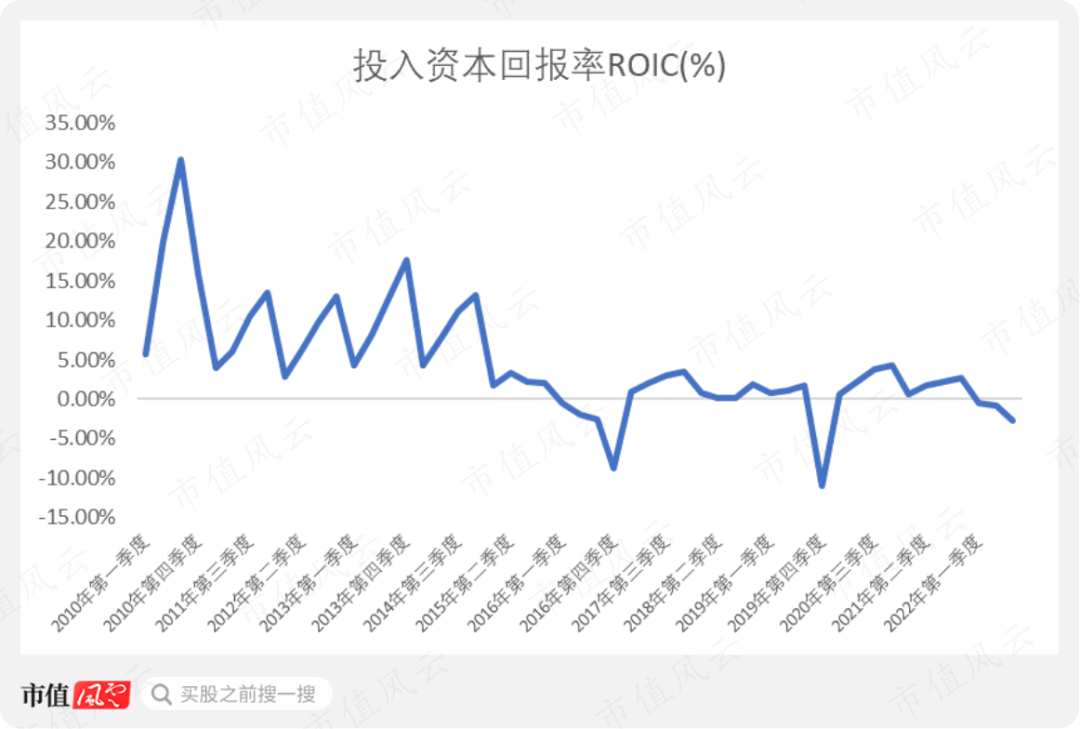 如果从另一个维度来看,公司对于投资的资金产生的收益,也就是投入资本回报率,自2014年以后,依然是个伤心的故事。