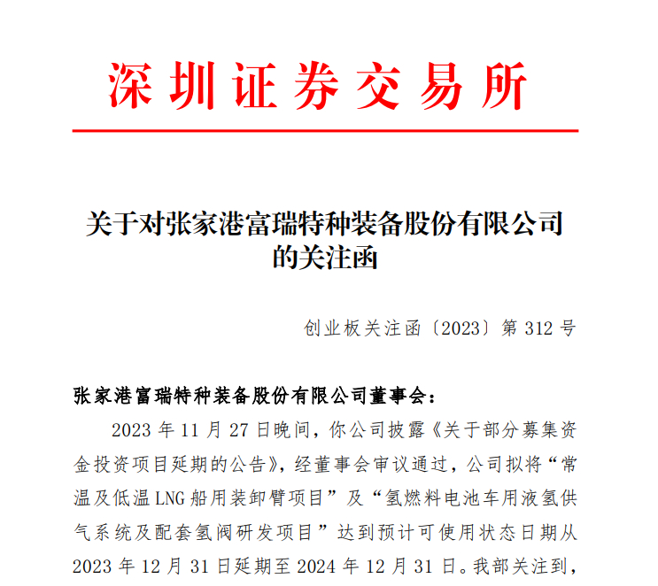关注函显示,2023年11月27日晚间,富瑞特装披露《关于部分募集资金投资项目延期的公告》,经董事会审议通过,公司拟将“常温及低温LNG船用装卸臂项目”及“氢燃料电池车用液氢供气系统及配套氢阀研发项目”达到预计可使用状态日期从2023年12月31日延期至2024年12月31日。