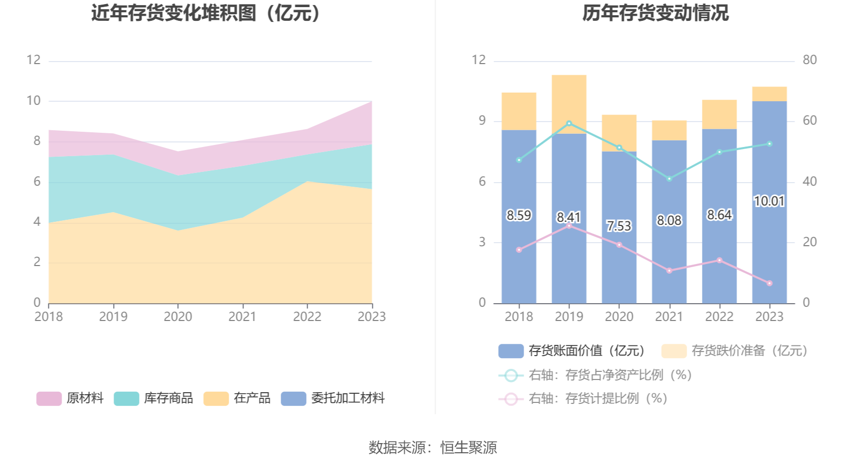 从存货变动来看,截至2023年年末,公司存货账面价值为10.01亿元,占净资产的52.7%,较上年末增加1.37亿元。其中,存货跌价准备为7152.33万元,计提比例为6.67%。
