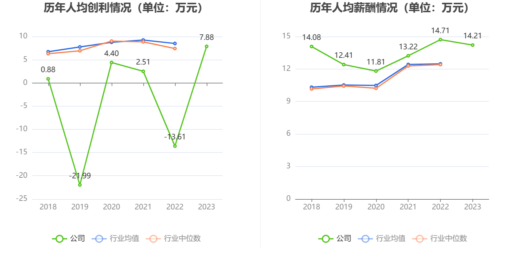 截至2023年末,公司员工总数为1867人,人均创收162.75万元,人均创利7.88万元,人均薪酬14.21万元,较上年同期分别变化66.51%、157.91%、-3.38%。