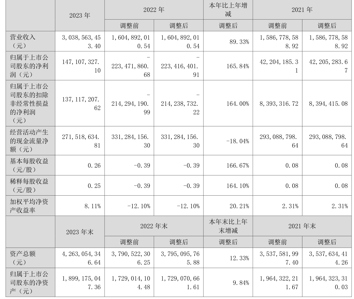 数据显示,2023年公司加权平均净资产收益率为8.11%,较上年同期增长20.21个百分点;公司2023年投入资本回报率为8.24%,较上年同期增长16.01个百分点。