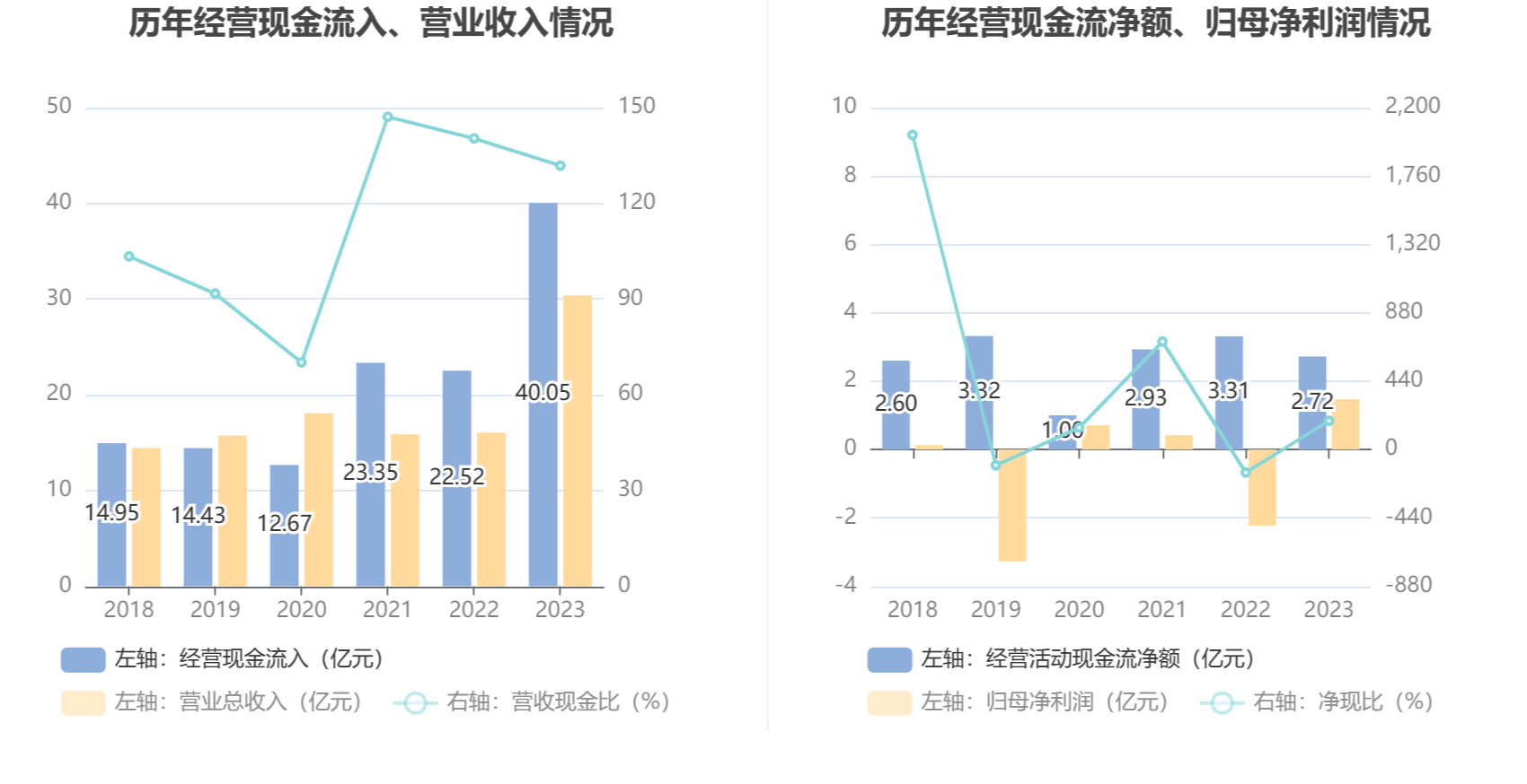 2023年,公司营业收入现金比为131.81%,净现比为184.57%。