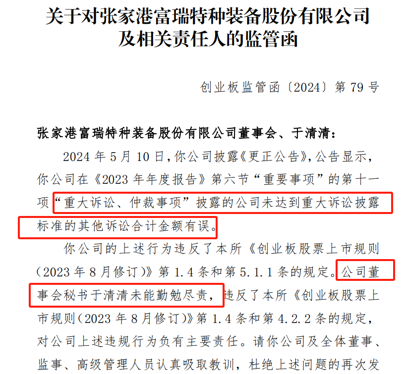富瑞特装收监管函,公司在《2023年年度报告》第六节“重要事项”的第十一项“重大诉讼、仲裁事项”披露的公司未达到重大诉讼披露标准的其他诉讼合计金额有误。