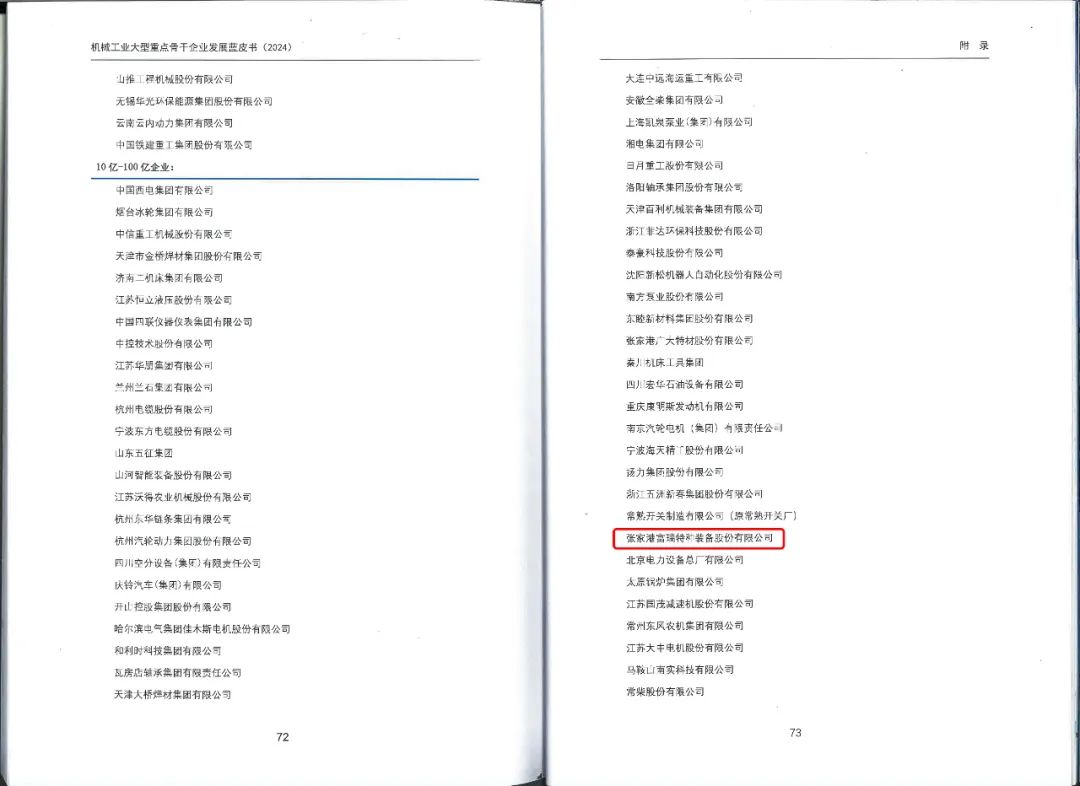 2023年-2024年,机械工业大型重点骨干企业在复杂多变的国内外环境中,展现出了顽强的生命力和强大的竞争力。它们始终坚持创新驱动、深化结构调整、加强国际合作,为推动我国机械工业高质量发展作出了重要贡献。为了系统总结这些企业的成功经验与成果,大会适时发布了《机械工业大型重点骨干企业发展蓝皮书(2024)》,该蓝皮书由罗俊杰执行副会长与陈士华副秘书长共同发布。张家港富瑞特种装备股份有限公司凭借其在10亿至100亿市值区间的杰出表现,成功入选“机械工业大型重点骨干企业研究工作企业名单(2024)”,彰显了其在行业内的强劲发展势头。
