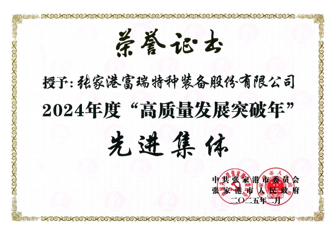 近日,中共张家港市委员会、张家港市人民政府授予张家港富瑞特种装备股份有限公司2024年度“高质量发展突破年”先进集体荣誉称号。这份荣誉的获得,不仅是对其过往一年公司发展轨迹的深度肯定,也是对全体富瑞人拼搏奋进的嘉奖。