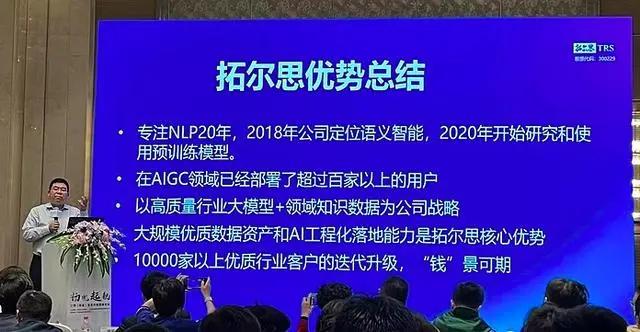 首先,施水才总经理详细介绍了拓尔思拥有的100亿+主题类资源性数据资产,以及覆盖8大业务场景的30000中标签。这些丰富的数据资源为NLP技术的发展和应用提供了强大的支持。