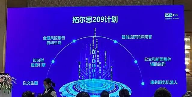 紧接着,施总经理向大家展示了拓尔思209计划的六大核心项目:金融风控报告自动生成、知识型搜索引擎、以文生图、智能投研知识间答、公文和新闻稿件辅助创作以及康养服务机器人。这些项目无一不体现了NLP技术在各行业的广泛应用前景。