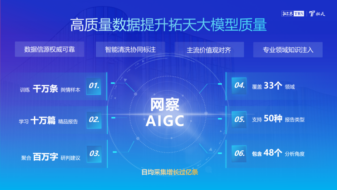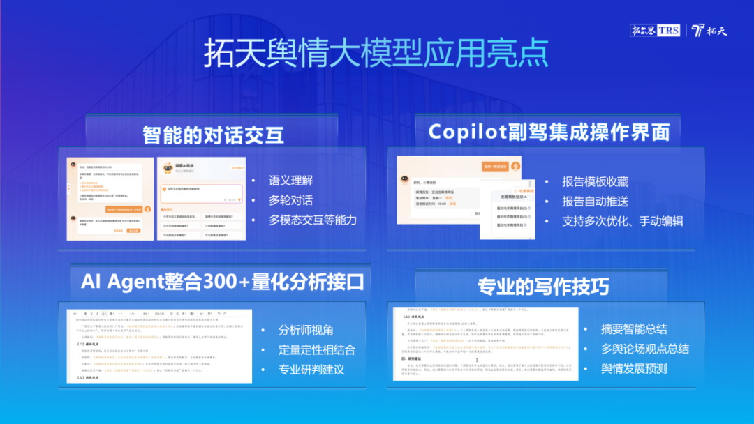 尹世杰表示,千亿规模高质量数据与三十年NLP技术积累共同构成了拓天大模型从通用走向专业的土壤。拓天舆情大模型以舆情报告智能写作、舆情分析问答助手两大关键场景作为切入点,与拓尔思现有的网察大数据分析平台耦合,更好地满足行业客户对舆情报告的需求。
