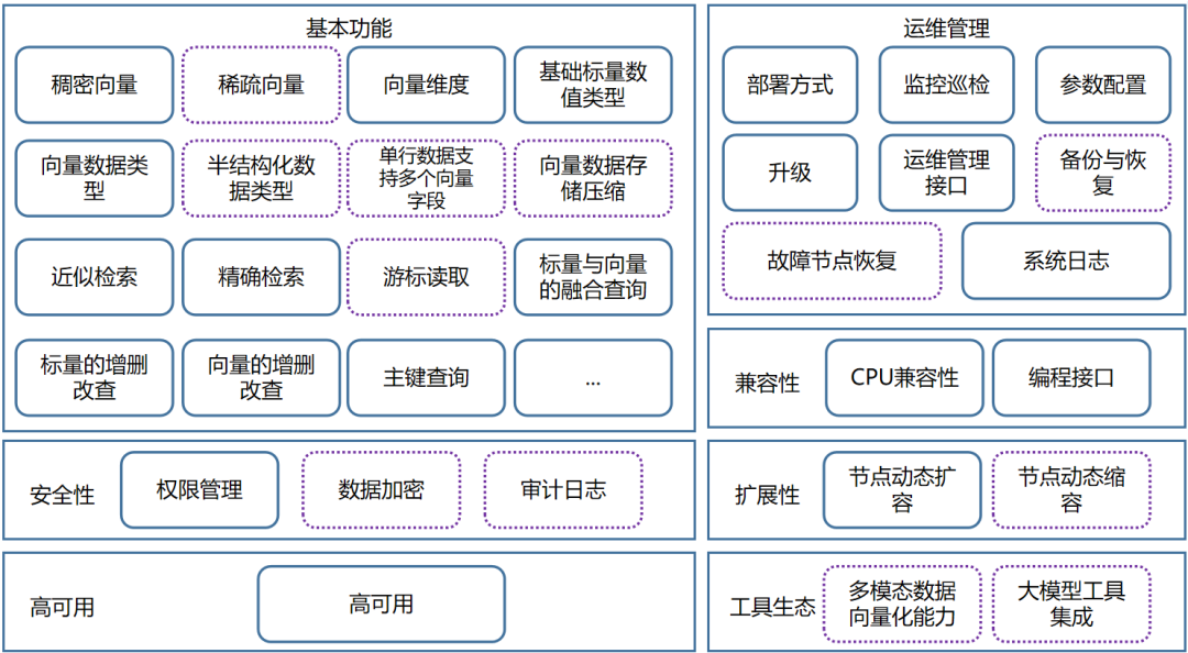 《向量数据库技术要求》是中国信通院云计算与大数据研究所依托中国通信标准化协会大数据技术标准推进委员会(CCSA TC601)和中国信通院数据库应用创新实验室(CAICT DBL),联合超过50家企业专家参与编制的技术标准,拓尔思为核心参编单位之一。其包含基本功能、运维管理、安全性、兼容性、扩展性、高可用以及工具生态七大能力域共47个测试项,其中分为27个必选项和20个可选项。作为业内首个向量数据库技术标准,可为向量数据库的研发、测试以及选型提供参考。