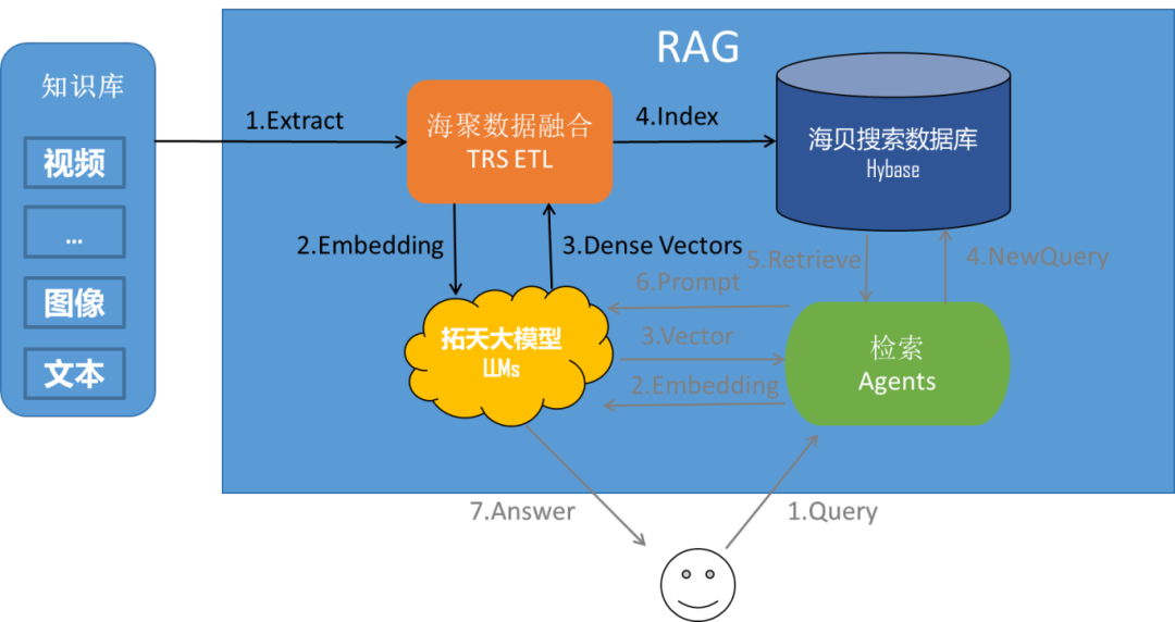 依托TRS海贝搜索数据库强大的检索能力,TRS海聚数据融合平台的数据整合能力以及TRS拓天大模型的生成能力,拓尔思打造了一套完整的检索增强生成解决方案。该解决方案充分发挥信息检索和大模型生成的优势,为用户提供更准确、实时和可靠的生成能力,增强用户的信息获取体验。