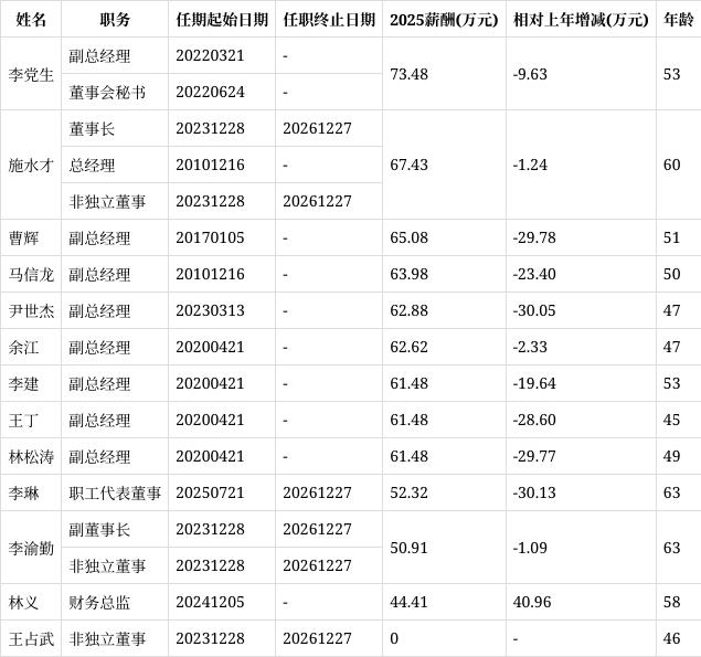 从薪酬看,董事和高级管理人员合计领取报酬727.55万元,平均薪酬61.38万元,年薪中位数为62.62万元。其中,副总经理及董事会秘书李党生薪酬最高为73.48万元,财务总监林义薪酬最低为44.41万元(2025年任期不满1年的不参与统计)。