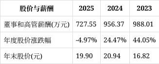 近三年董事和高级管理人员薪酬方面,2023年薪酬总额为988.01万元,2024年薪酬总额为956.37万元,2025年薪酬总额为727.55万元。从2023年到2025年,董事和高管薪酬总额减少260.46万元,降幅26.36%。