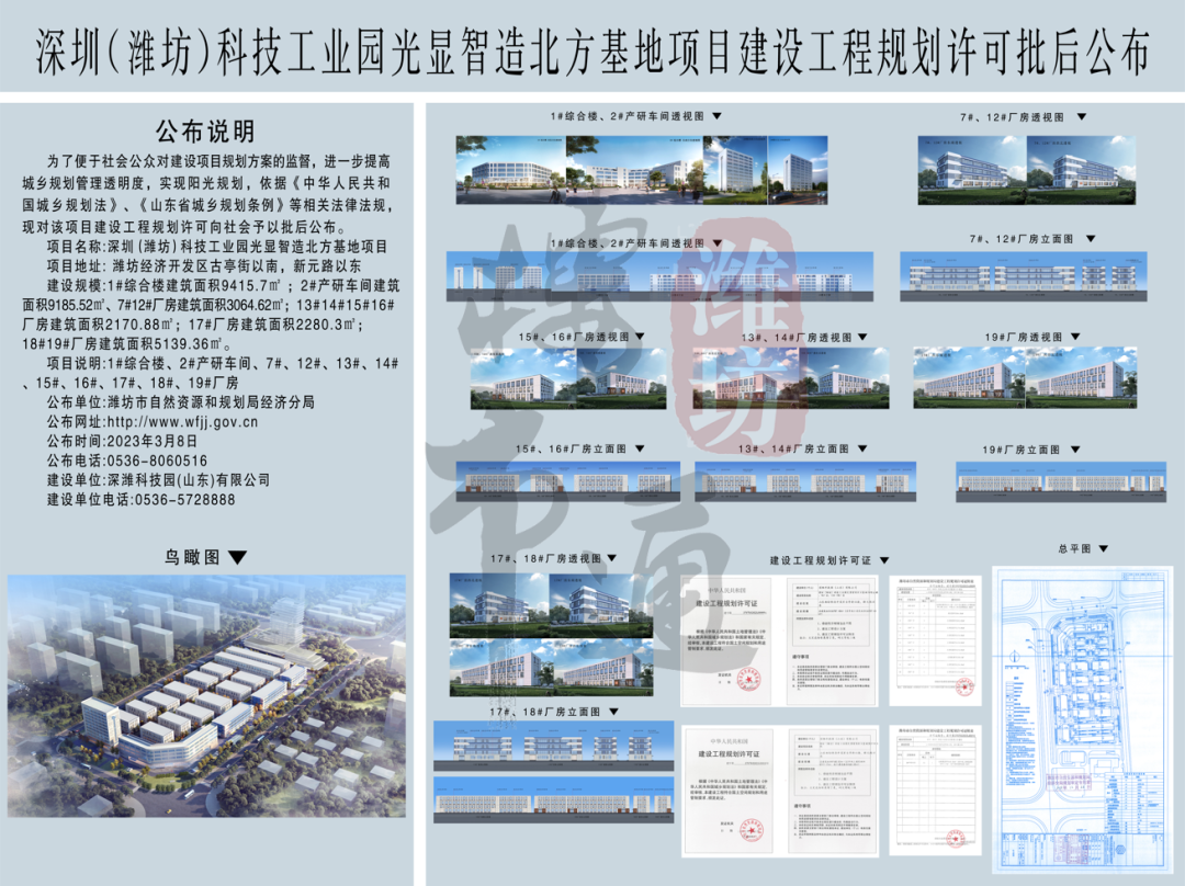 据潍坊楼市通报道,3月8日,深圳(潍坊)科技工业园光显智造北方基地项目建设工程规划许可批后公布。