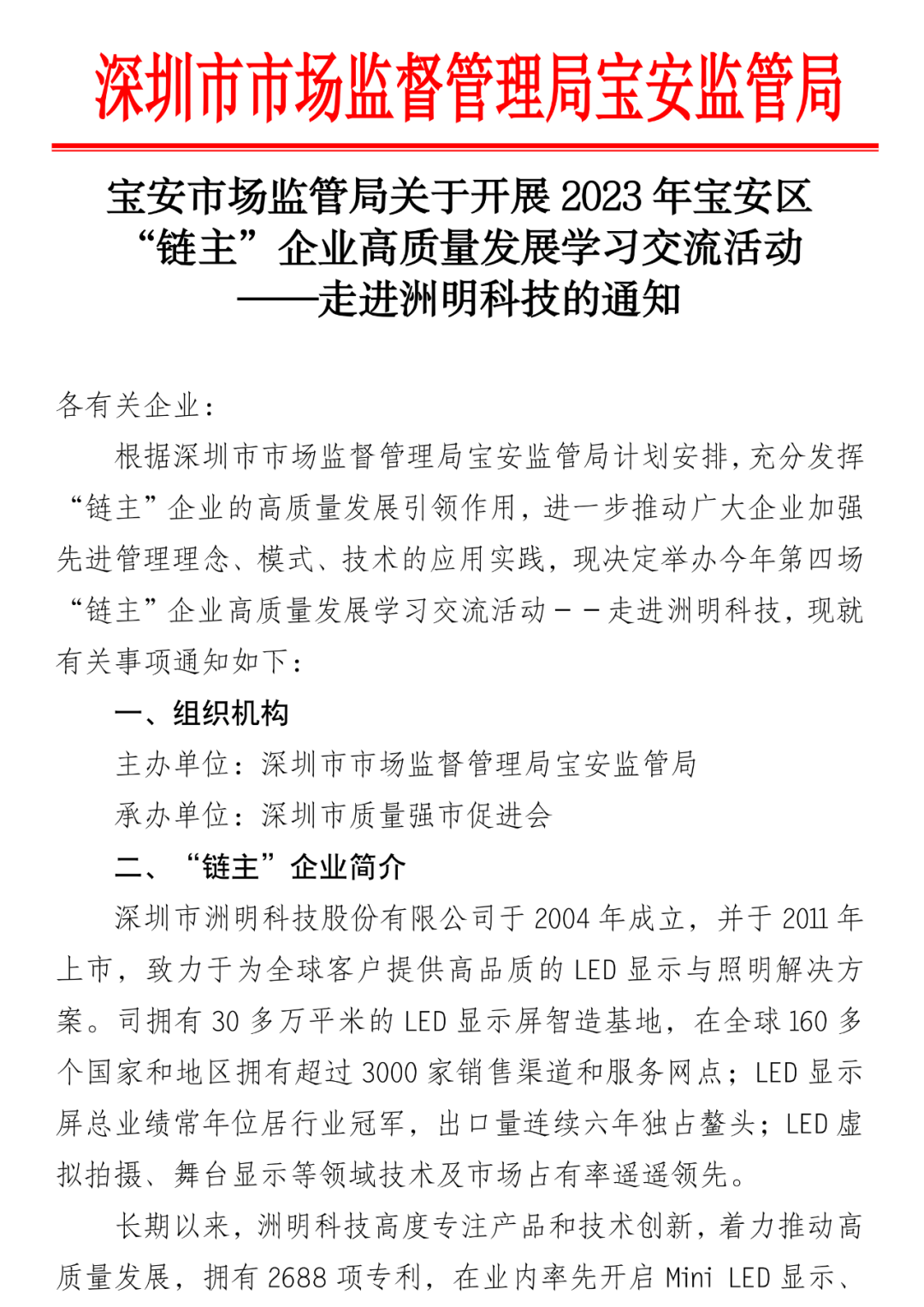 关于开展2023年宝安区“链主”企业高质量发展学习交流活动—走进洲明科技的通知