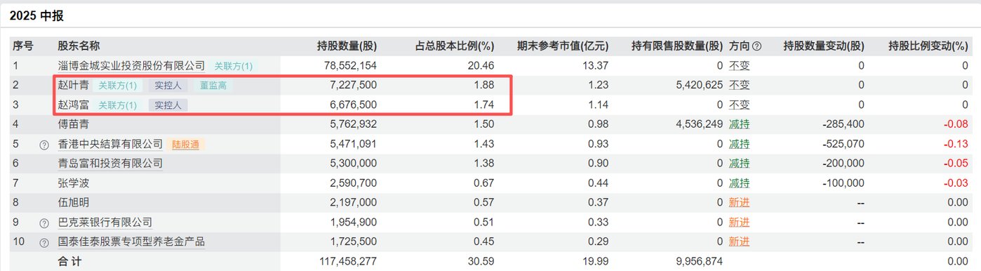 截至2025年中报,赵叶青、赵鸿富分别直接持股金城医药1.88%、1.74%;同时,赵氏父子还通过金城实业持股20.46%。截至今日收盘,金城医药收报18.84元/股,涨2.22%,市值72亿元,以此估算赵氏父子持股市值合计约17.42亿元。