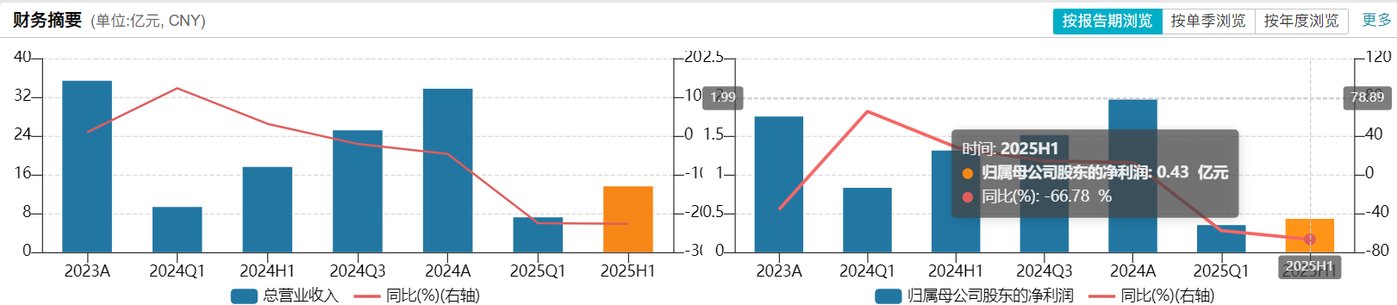 2025年半年报显示,金城医药上半年收入13.6亿元,同比下降22.65%;归母净利润4338.32万元,同比下降66.78%,呈现量缩利减的局面。此外,经营活动产生的现金流量净额为1.04亿元,同比下降40.34%,主因销售下降及回款减少;基本每股收益为0.11元/股,同比下降67.65%;扣非每股收益为0.1元/股,同样下滑明显。