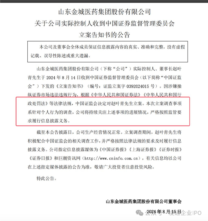 金城医药发布了关于公司实际控制人收到行政处罚事先告知书的公告。