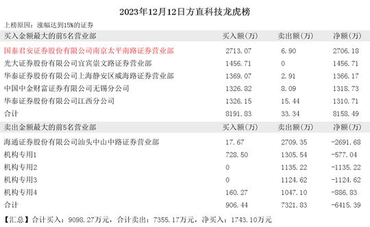 截止收盘,方直科技报收14.57元/股,涨幅20.02%,成交量80万手,成交额11.38亿元,换手率39.5%。今日1板。