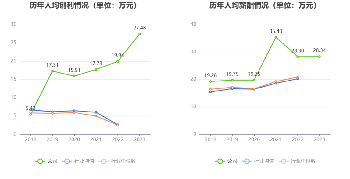 截至2023年末,公司员工总数为116人,人均创收87.71万元,人均创利27.48万元,人均薪酬28.34万元,较上年同期分别变化-4.80%、37.81%、0.15%。