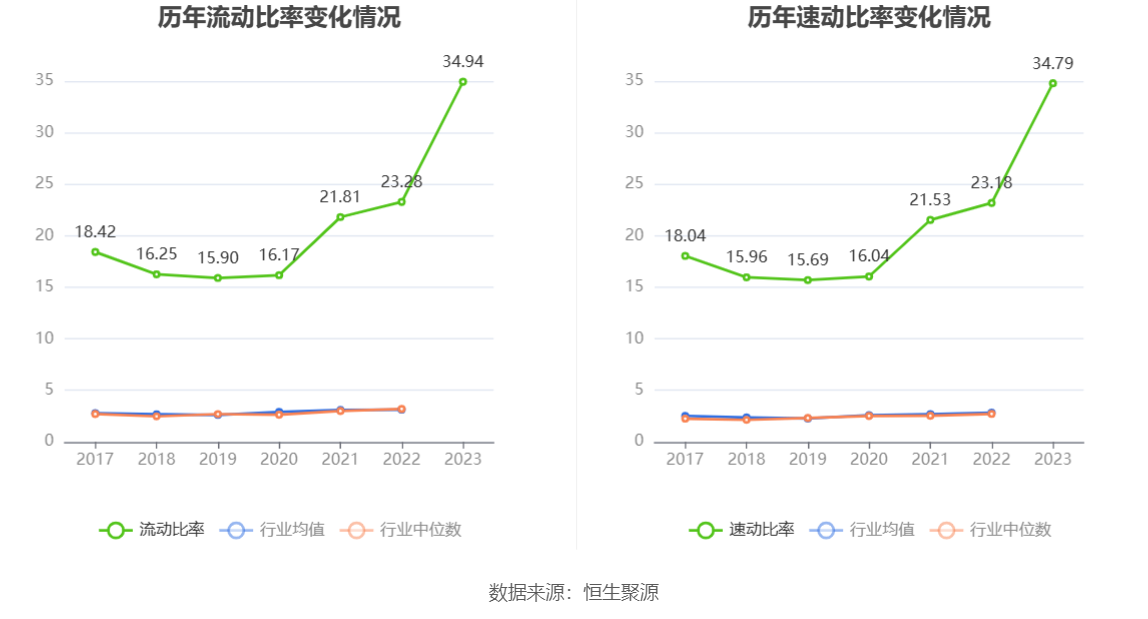 2023年,公司流动比率为34.94,速动比率为34.79。