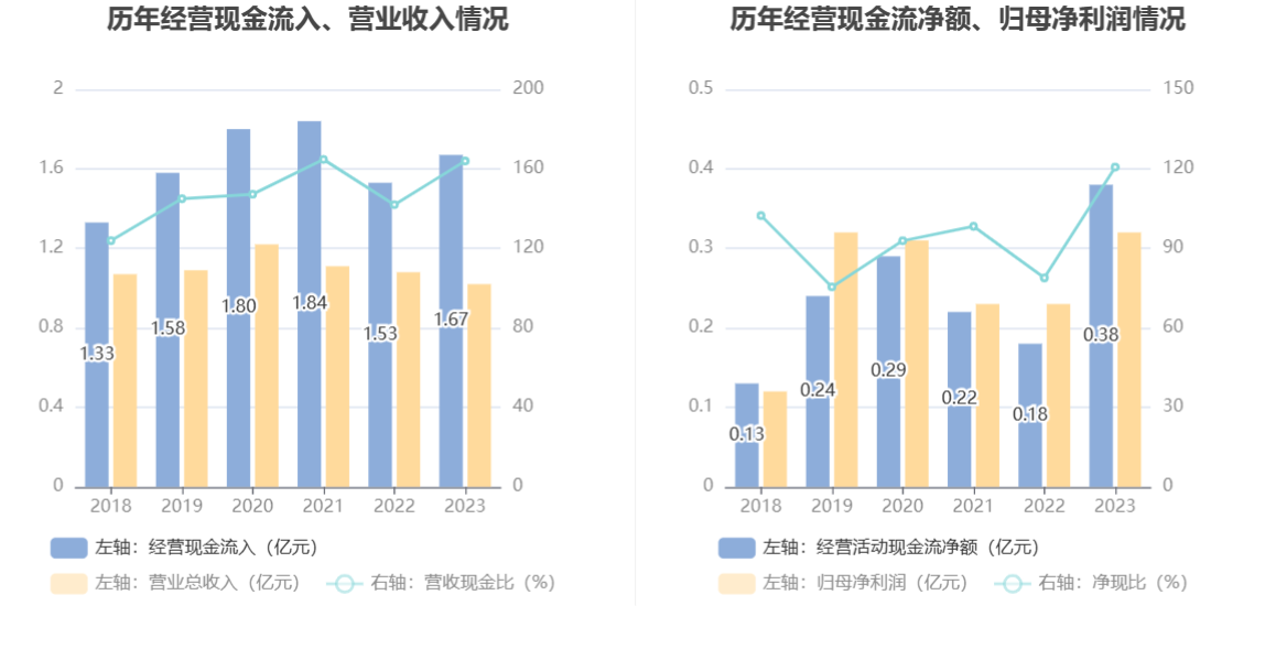 2023年,公司营业收入现金比为163.96%,净现比为120.66%。