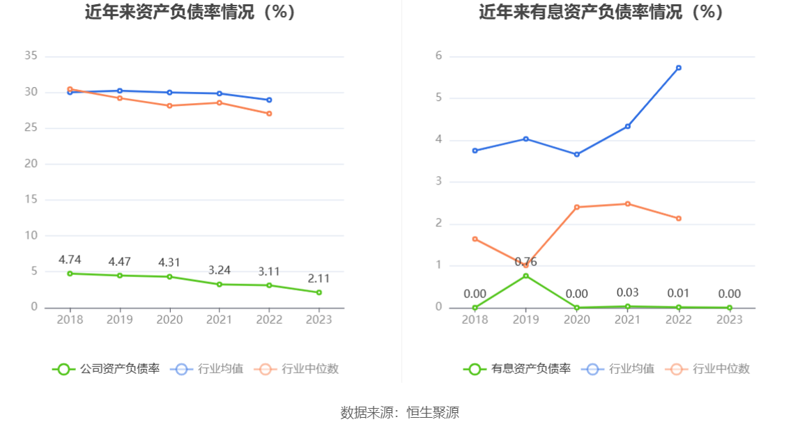 在偿债能力方面,公司2023年年末资产负债率为2.11%,相比上年末下降1.00个百分点;有息资产负债率为0.00%,相比上年末下降0.01个百分点。