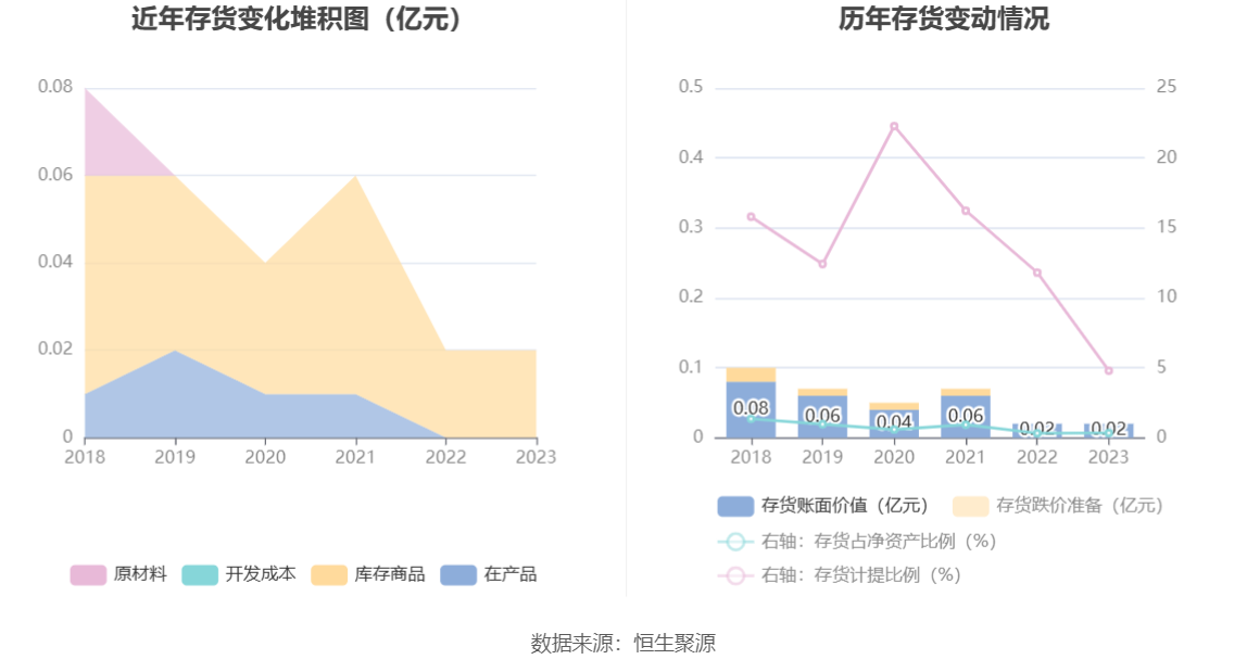 从存货变动来看,截至2023年末,公司存货账面价值为237.3万元,占净资产的0.34%,较上年末增加18.87万元。其中,存货跌价准备为11.95万元,计提比例为4.79%。