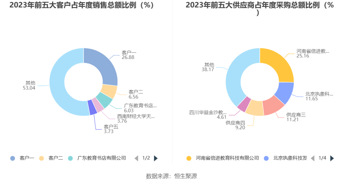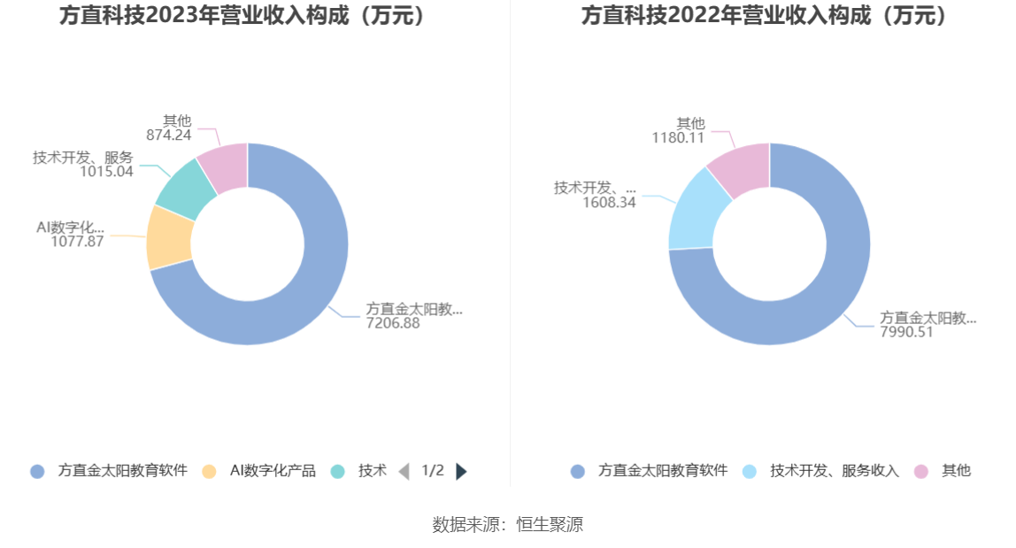 分产品看,方直金太阳教育软件、AI数字化产品、技术开发、服务2023年毛利率分别为80.85%、60.16%、91.50%。