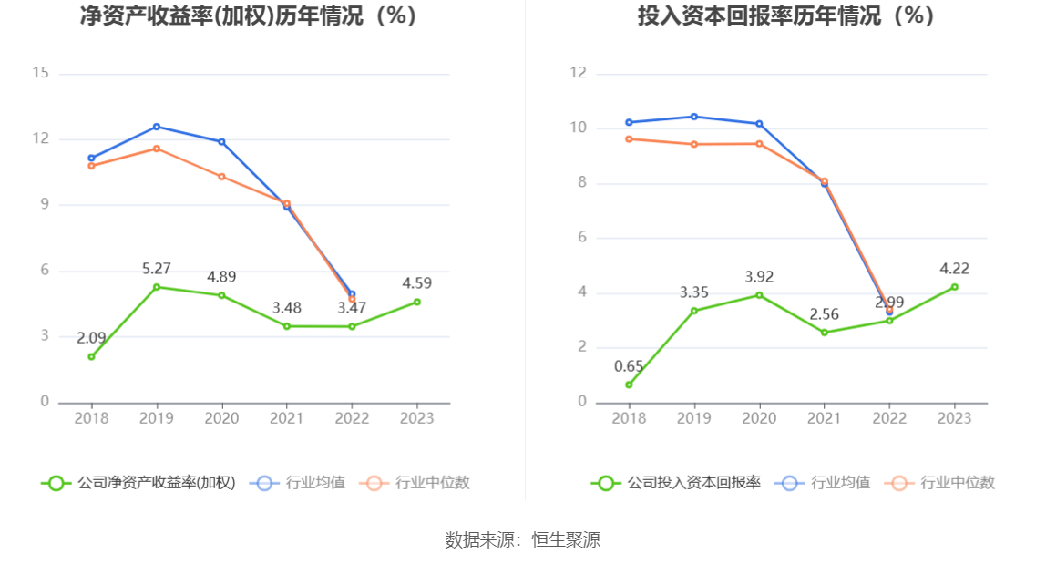 数据显示,2023年公司加权平均净资产收益率为4.59%,较上年同期增长1.12个百分点;公司2023年投入资本回报率为4.22%,较上年同期增长1.23个百分点。