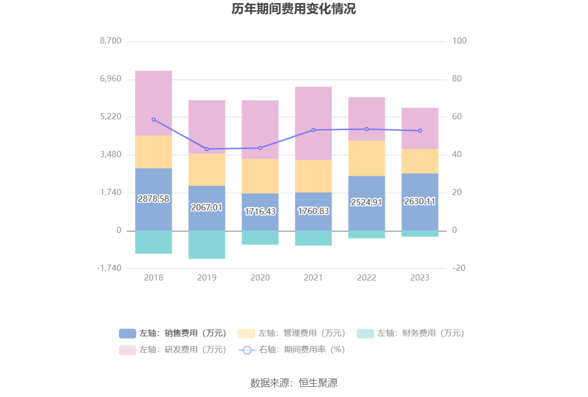 2023年,公司期间费用为5379.08万元,较上年同期减少411.45万元;期间费用率为52.87%,较上年同期下降0.85个百分点。其中,销售费用同比增长4.17%,管理费用同比下降30.09%,研发费用同比下降5.24%,财务费用由去年同期的-347.82万元变为-273.35万元。