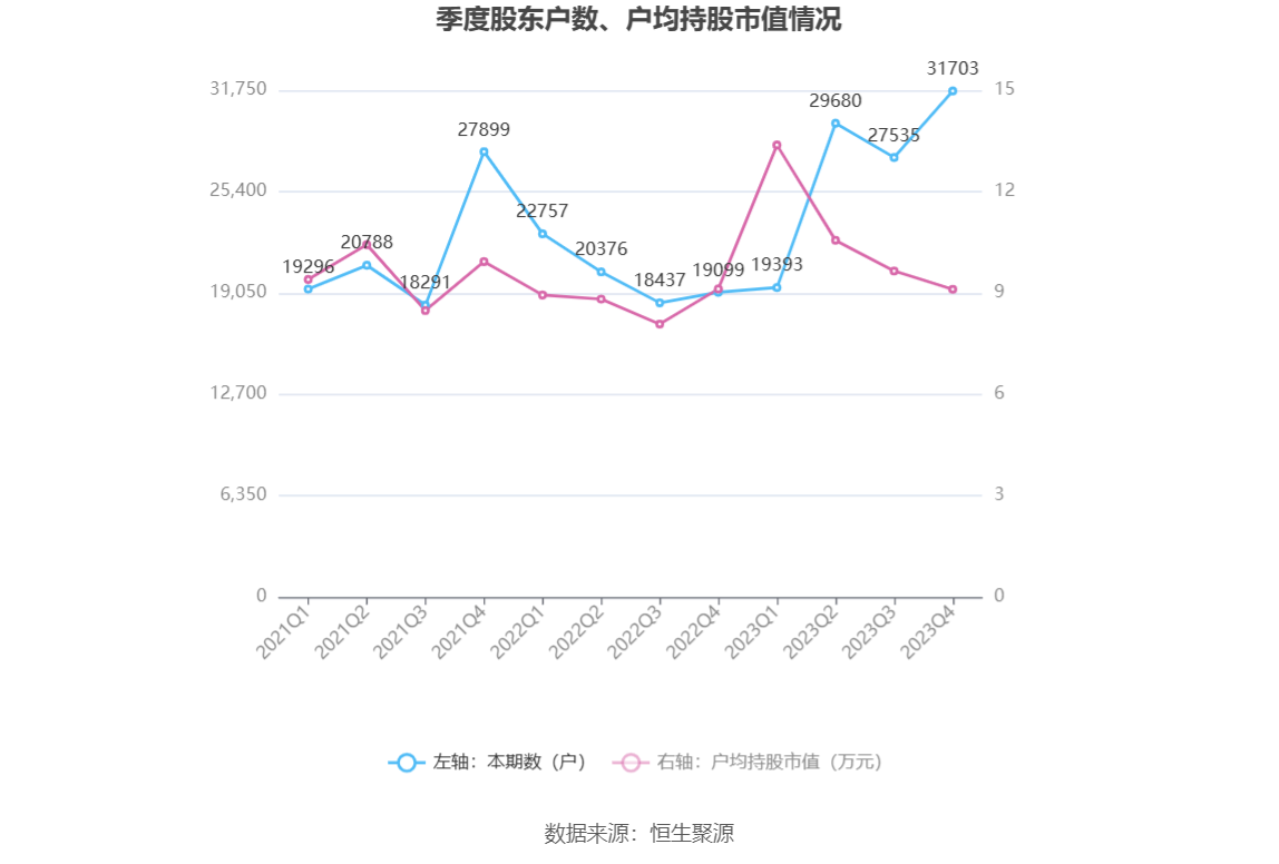 筹码集中度方面,截至2023年年末,公司股东总户数为3.17万户,较三季度末增长了4168户,增幅15.14%;户均持股市值由三季度末的9.65万元下降至9.11万元,降幅为5.60%。