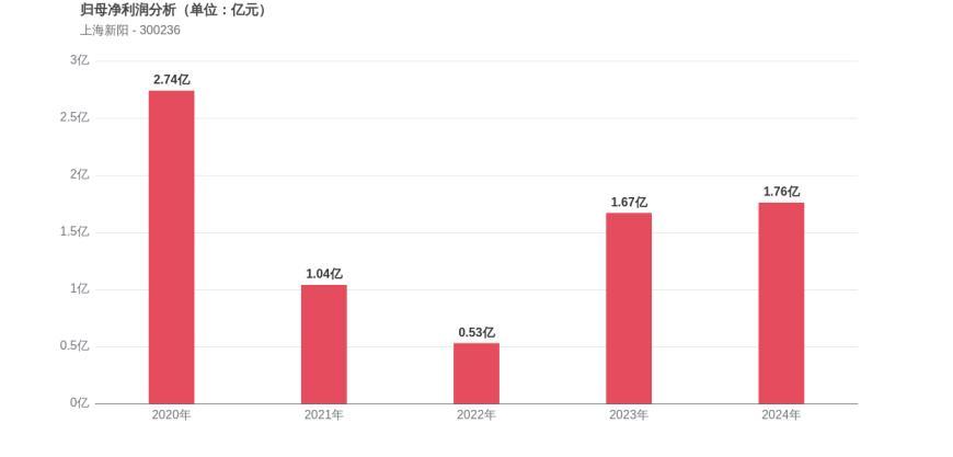 利润角度分析,2020年上海新阳实现归母净利润2.74亿元,2024年1.76亿元。期间利润出现较大波动,2021年和2022年连续下滑,2023年大幅反弹后2024年小幅增长。