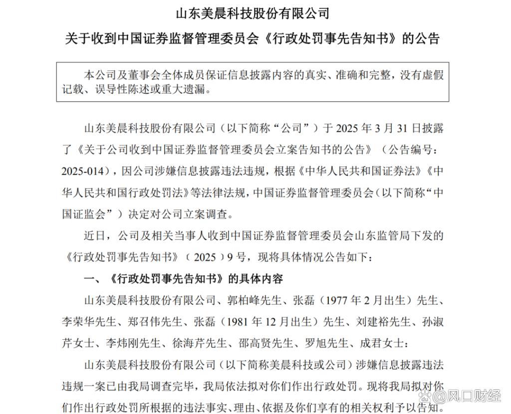 值得关注的是,此次高管变动发生在ST美晨因历史财务造假问题被监管重罚的背景下。2025年9月26日,公司公告收到中国证监会山东监管局下发的《行政处罚事先告知书》。经查,2014年至2018年期间,ST美晨于2014年收购的杭州赛石园林集团有限公司(简称“赛石园林”)存在系统性财务造假行为。