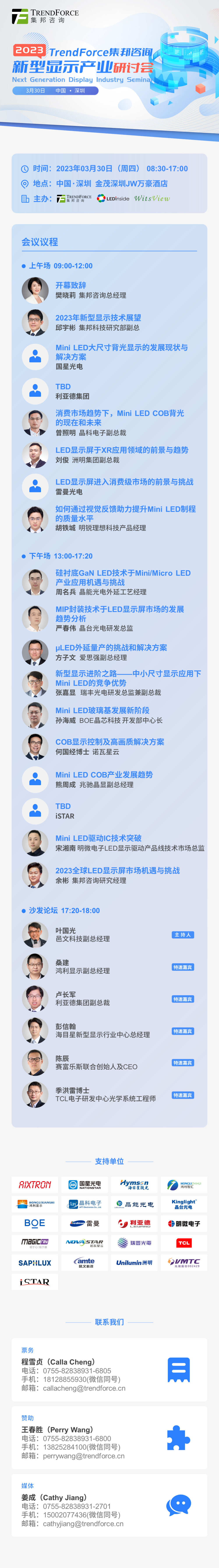 由TrendForce集邦咨询旗下LEDinside、WitsView主办的2023集邦咨询新型显示产业研讨会将于3月30日在金茂深圳JW万豪酒店举办。