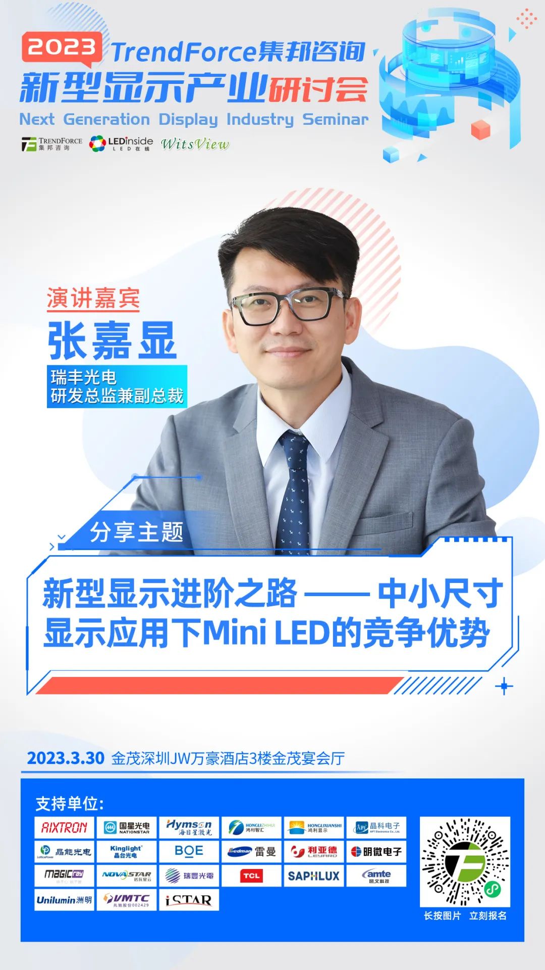 我们邀请到瑞丰光电研发总监兼副总裁张嘉显先生,他将以“新型显示进阶之路——中小尺寸显示应用下Mini LED的竞争优势”为主题带来精彩分享。
