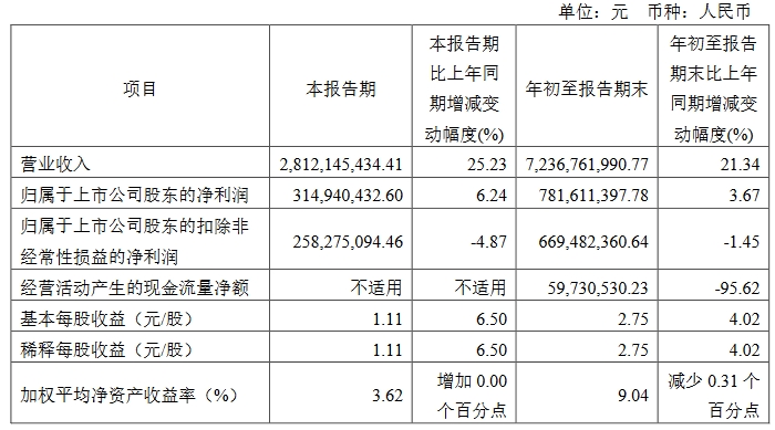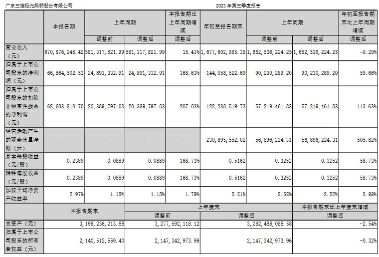 第三季度,三雄极光实现营收6.71亿元,同比增长15.41%;归母净利润为0.67亿元,同比增长168.63%。前三季度,公司实现营收16.78亿元,同比降0.29%;归母净利润为1.44亿元,同比增长59.66%。