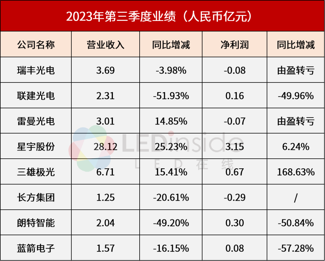 近日,瑞丰光电、联建光电、雷曼光电、星宇股份等LED相关企业公布三季度业绩。其中,星宇股份、三雄极光实现营收与利润双增长。