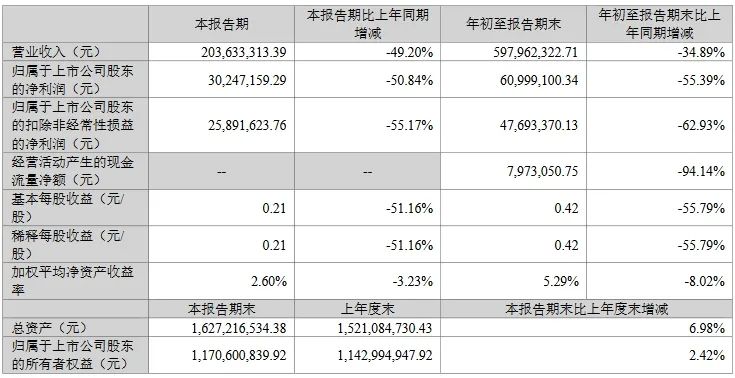 第三季度,朗特智能实现营收2.04亿元,同比下降49.20%;归母净利润为0.30亿元,同比下降50.84%。前三季度,公司实现营收5.98亿元,同比下降34.89%;归母净利润为0.61亿元,同比下降55.39%。