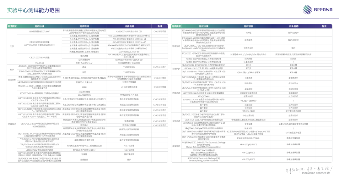 瑞丰光电实验中心拥有广泛丰富的测试能力,建有光电热性能测试室、失效分析室、可靠性室等三大核心实验室,拥有LED光电色热性能测试、环境试验、电学性能、表面测试、电子元器件失效分析等100+项测试能力,可以为不同行业提供产品测试服务,测试结果均可溯源至国家计量院。